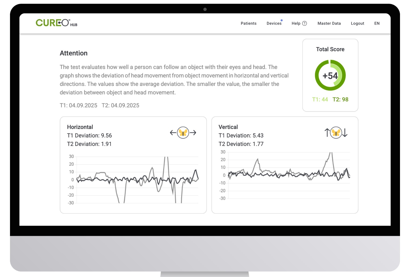 CUREO addresses sensorimotor, cognitive, and perceptual impairments. The high frequency, immersive therapy with multimodal feedback has a positive effect on neuronal processes and contributes to the recovery of motor and cognitive skills as well as the improvement of sensory perception, which leads to improved everyday ability. Increased motivation through gamification, quickly visible training progress, and active relaxation tools contribute to the success of the therapy.