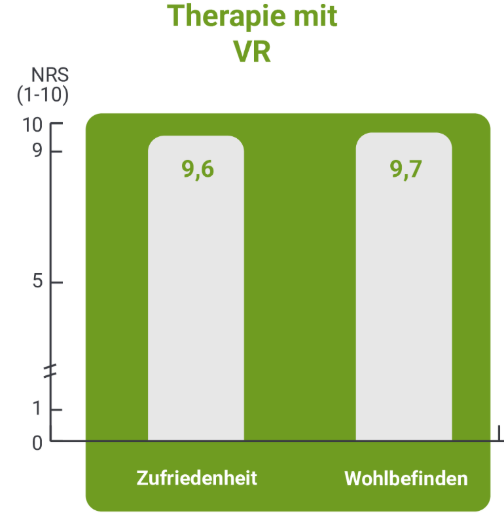 Nach jeder VR-Einheit bewerteten die Patientinnen und Patienten ihre Erfahrungen anhand standardisierter Fragebögen. Erfasst wurden unter anderem Zufriedenheit, Wohlbefinden, subjektive Effektivität, Anstrengung im Vergleich zu anderen Therapieformen sowie die gewünschte Nutzungshäufigkeit.